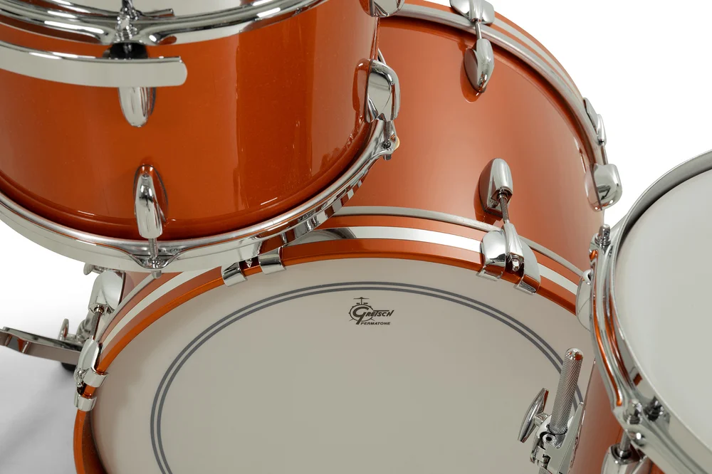 Broadkaster Series | Finish: Satin CopperSizes: 12x8 TT, 14x14 FT, 18x14 BD | Specifications: All standard hardware, Bass drum undrilled, matching Satin Copper wood hoops with Chrome inlay.