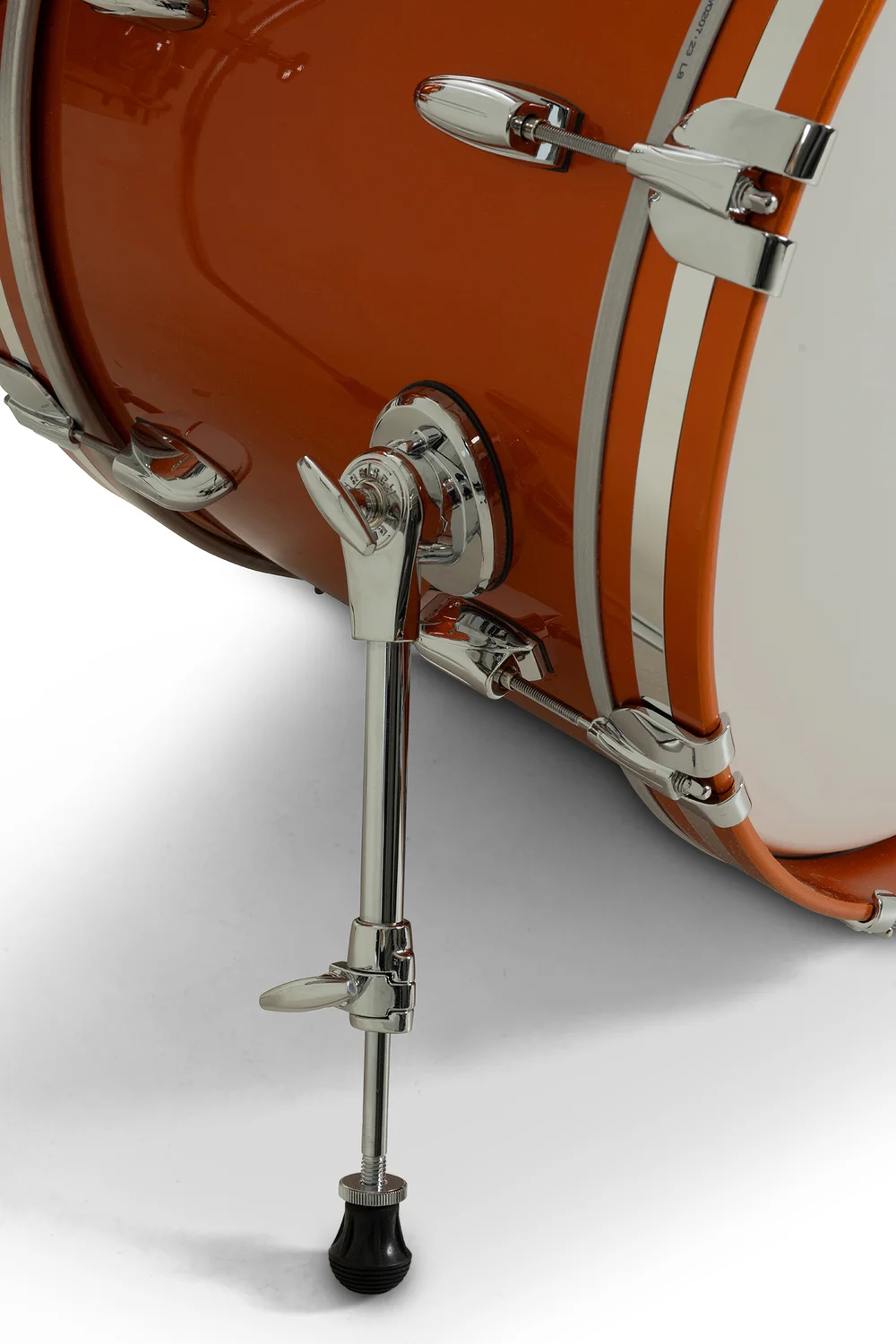 Specifications: All standard hardware, Bass drum undrilled + matching Tangerine Metallic Gloss bass drums hoops with Chrome inlays.